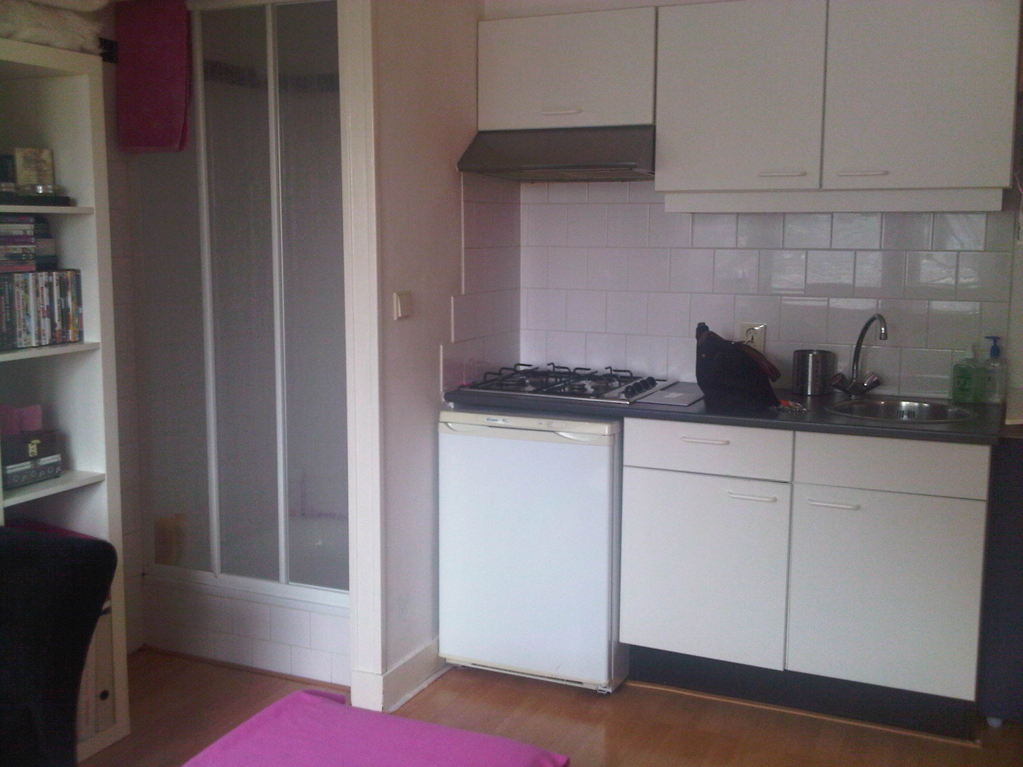 The student room features a private kitchen equipped with a gas hob, extractor hood and fridge, as well as a private shower. The separate bedroom creates a pleasant division between living and sleeping areas, making this student room feel spacious and practical. The toilet is shared. The student room is finished in a neat condition and ready for immediate occupancy. A shared washing machine is available for residents.
