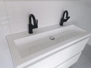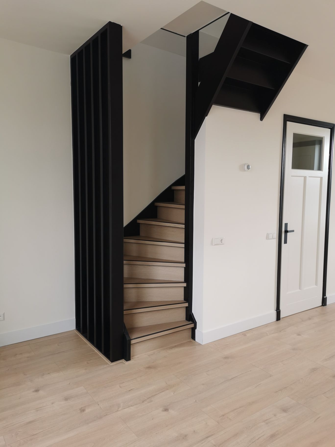 At the front of the living room, the staircase leads to the upper floor with two well-sized bedrooms and a luxurious bathroom. The bathroom features a double sink, second toilet, a modern shower cabin, washing machine connection and elegant black taps and accessories. A true gem in this pleasant neighbourhood.