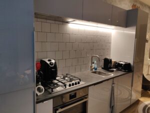 The apartment features a bright and inviting living space with a clean, authentic details that reflect the character of the building. The modern kitchen is fully equipped with new appliances, including a gas hob, extractor hood, dishwasher, refrigerator, and washing machine, providing everything needed for comfortable day-to-day living.